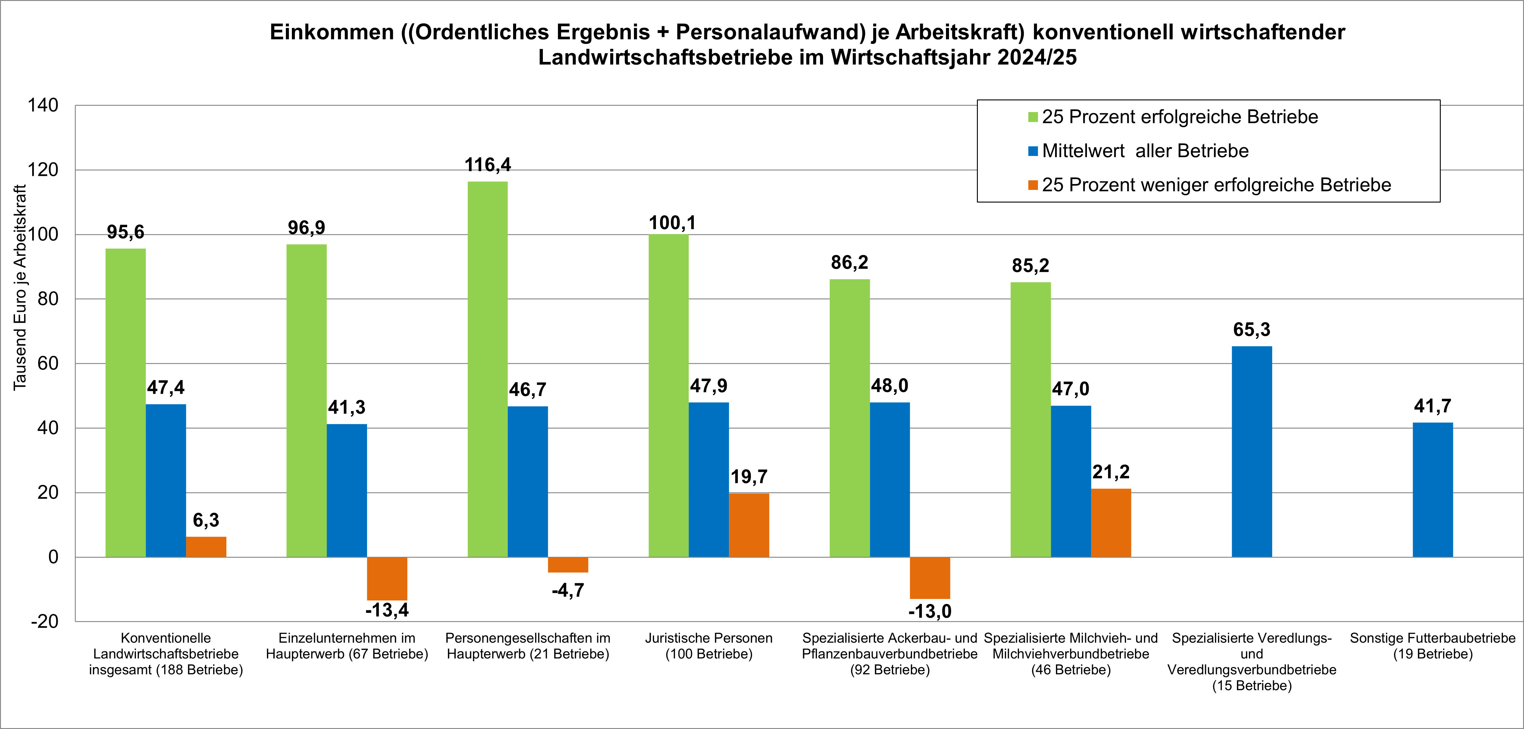 | Einkommen1) je Arbeitskraft konventionell wirtschaftender Landwirtschaftsbetriebe im Wirtschaftsjahr 2024/25 nach Erfolgsgruppen2), Rechts- und Betriebsformvergleich | ||||